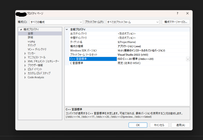 1.プロジェクトのプロパティ設定→全般:C++言語標準を自分の使いたいバージョンに設定(C++14とかC++20とか)