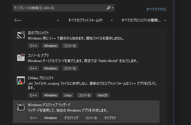 2.”デスクトップウィザード”のテンプレートを選択・・・フィルターでC++を選んでいるとわかりやすい(※フレームワークの作成であれば”スタティックライブラリを選択)